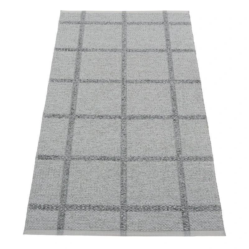Der Ada Teppich von der schwedischen Marke Pappelina ist mit einem metallischen Gittermuster verziert. Die Kanten des Teppichs sind verstärkt und verschweißt, was sie extrem langlebig macht.