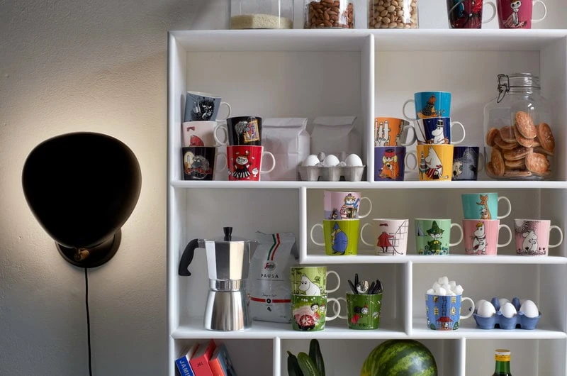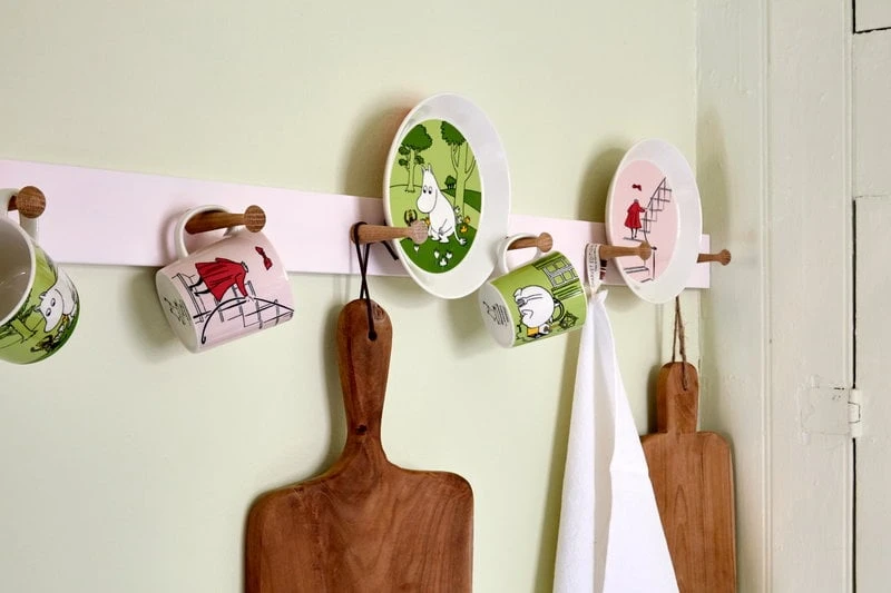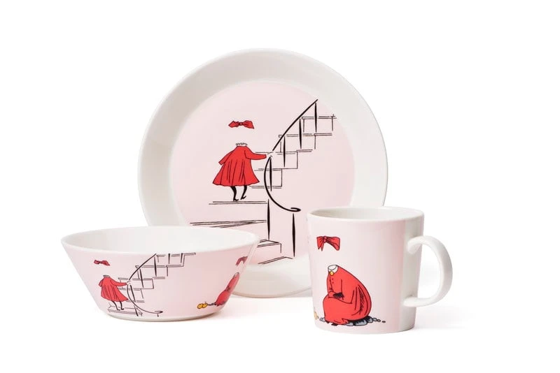 Die Tassen, Schalen und Teller der Geschirrkollektion Mumin Classics von Arabia zeigen die Figuren des Mumintals von vorne und hinten. Die ersten Stücke des Mumin-Geschirrs von Arabia kamen bereits in den 1950er Jahren heraus, und die Großproduktion begann 1990. Alle Illustrationen stammen von Tove Slotte, die sich von den Originalzeichnungen von Tove Jansson inspirieren lässt. Die Form der Kollektion stammt vom zeitlosen Teema-Keramikgeschirr von Arabia, welches von Kaj Franck entworfen wurde.