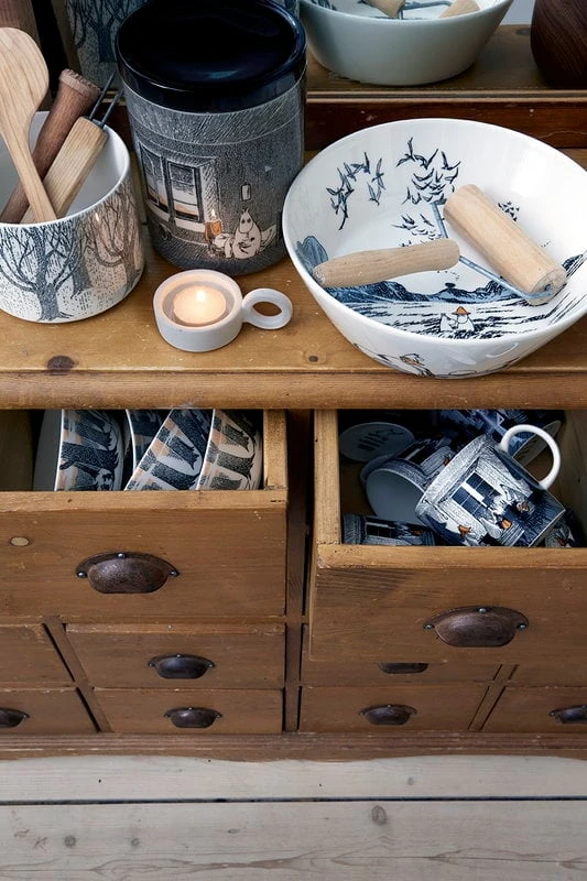 Die ersten Stücke des Mumin-Geschirrs von Arabia kamen bereits in den 1950er Jahren heraus, und die Großproduktion begann 1990. Die Form der Kollektion stammt vom zeitlosen Teema-Keramikgeschirr von Arabia, welches von Kaj Franck entworfen wurde.