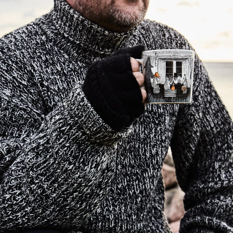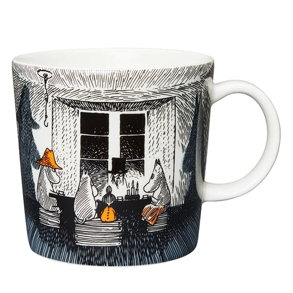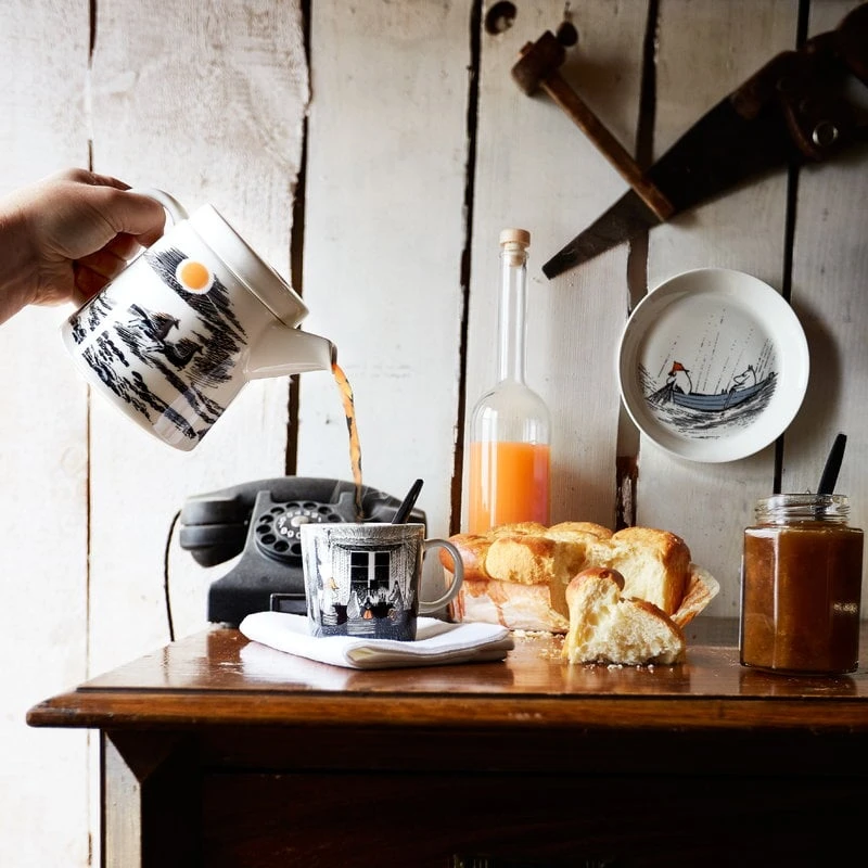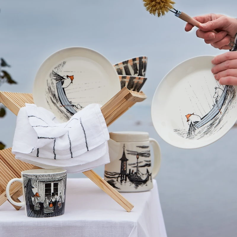 Die Mumin-Tasse aus der Kollektion True to Its Origins von Arabia ist Teil einer Geschirrkollektion, die von Tove Janssons Romanen Mumins wundersame Inselabenteuer (1965) und Herbst im Mumintal (1970) inspiriert ist. Das erste Buch erzählt die Geschichte der Mumin-Familie, die auf eine weit entfernte Leuchtturminsel zieht, und das zweite ist das letzte Mumin-Buch der Künstlerin, das sie nach dem Tod ihrer Mutter schrieb. Die Themen der Bücher – Sehnsucht, Einsamkeit und Wendepunkte im Leben – werden in der keramischen Teekanne, dem Krug, dem Teller, der Schale und der Tasse durch Janssons wunderschöne, melancholische Illustrationen vermittelt.