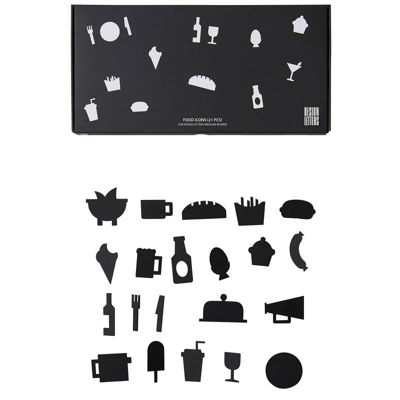 Die Essenssymbole verleihen dem Message Board von Design Letters eine fröhliche Note. Bekanntlich sagt ein Bild oft mehr als tausend Worte – die Symbole sind perfekt, um Ihren Notizen, Nachrichten und Ihrem Zuhause einen fröhlichen Akzent zu verleihen. Das grafische Design der Symbole passt perfekt zu den Buchstaben des Message Boards. Das Set enthält 21 Symbole zum Thema Essen.