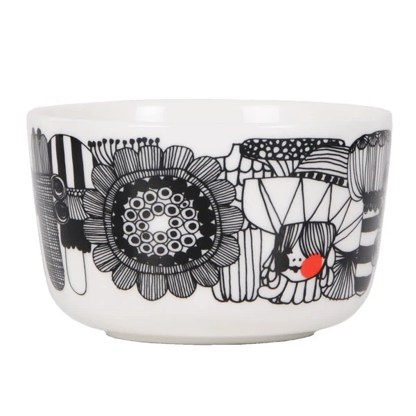 Marimekkos Schüssel Siirtolapuutarha trägt ein fröhliches Muster von Maija Louekari, das schöne Sommerblumen in Kleingärten darstellt.