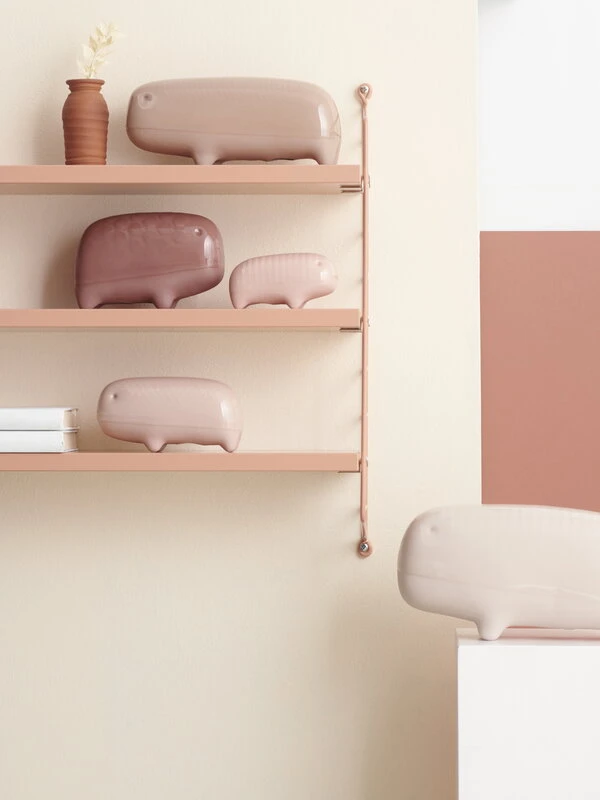 Die Primordial Animals sind in verschiedenen Größen in drei Farbfamilien erhältlich: Naturtöne, Blaugrüntöne und Rottöne. Zartrosa gehört zu den letzteren. In jeder Farbfamilie weist die Skulptur in Größe XL auf der glasierten Rückseite ein Streifenmuster auf, das von Skulptur zu Skulptur leicht variieren kann. Die genaue Positionierung der Glasur selbst oder der Augen der Kreatur kann ebenfalls variieren – jedes Primordial Animal ist einzigartig.