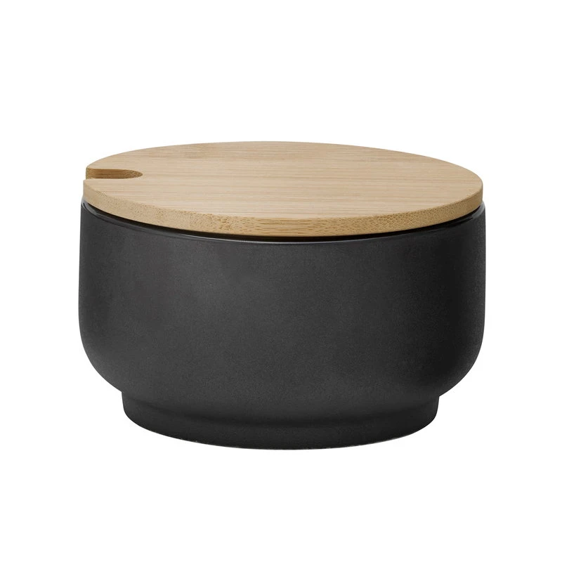 Die Zuckerdose Theo von Stelton besteht aus dunklem, rustikalem Steingut. Die Innenseite wurde mit einer glänzendennzenden Glasur beschichtet, die einen schönen Kontrast zu der schwarzen, matten Oberfläche bildet. Der Deckel ist aus Bambus gefertigt.