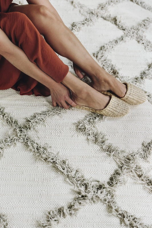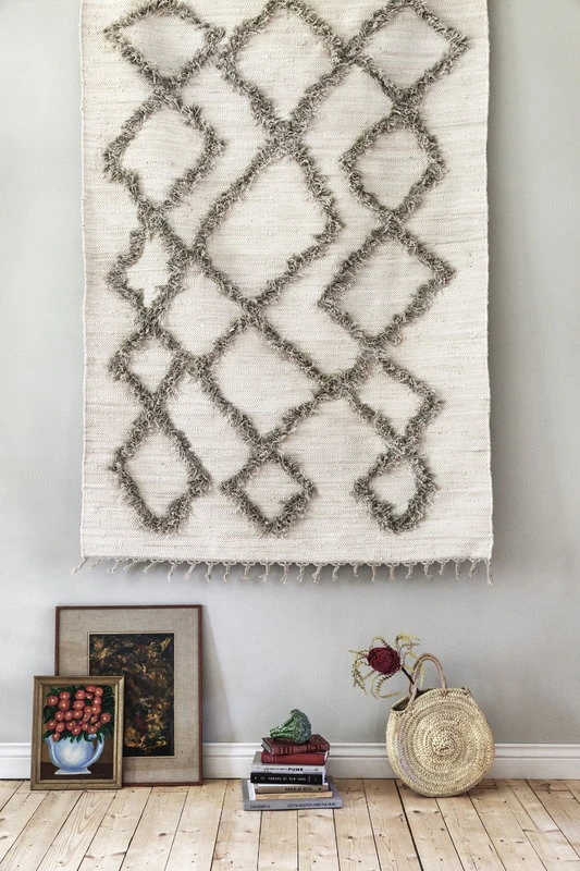 Der Teppich Tie von Finarte kombiniert die skandinavische Rya-Technik mit traditionellem Baumwoll-Flachgewebe – die Baumwolloberfläche kontrastiert mit flauschigen, kantigen Mustern, die dem Teppich einen verspielten Charakter verleihen. Der vom finnischen Duo Saana ja Olli entworfene Teppich Tie eignet sich als Wand- und Bodenteppich. Der Teppich Tie ist aus recycelter Baumwolle hergestellt und mit geflochtenen Enden versehen.