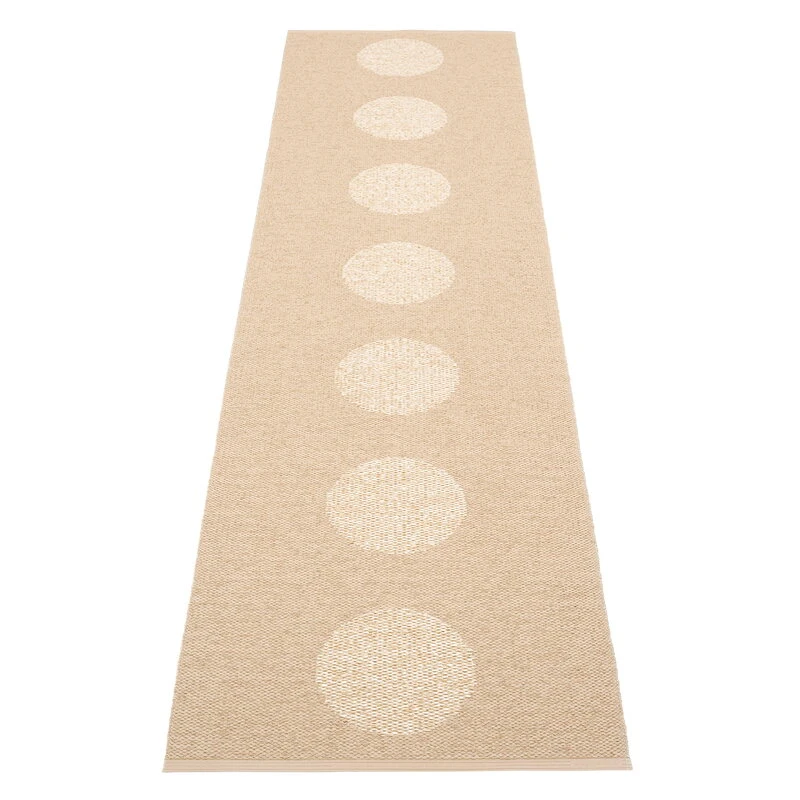 Der Vera-2.0-Teppich von Pappelina ist mit einem Muster aus großen Punkten versehen, die ein schlichtes, aber dennoch gewagtes Flair und einen sanften Metallic-Glanz in jedes Interieur bringen. Sein zweiseitiges Design eröffnet mehr Gestaltungsmöglichkeiten: Drehen Sie den Teppich einfach um, wenn Sie Lust auf eine neue Farbe haben. Der Teppich ist an den Rändern verstärkt und verschweißt und kann mit der Hand oder in der Waschmaschine gewaschen werden.